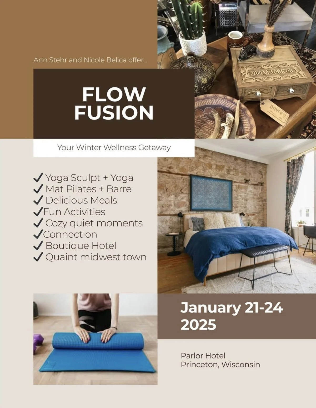 Join Ann Stehr and Nicole Belica for Flow Fusion. It's a vibrant, midweek winter wellness getaway designed to warm you from the inside out with sweaty movement, soul-nourishing practices, and all the good energy you’ve been craving.